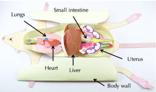 The model can be used look at the anatomy of the major body systems. It covers the circulatory system (heart and major blood vessels), respiratory system (lungs and trachea), digestive system (mouth, oesophagus, stomach, small intestine, colon, rectum, pancreas, liver), excretory system (kidneys and bladder) and male & female reproductive systems. It can also be used to show a pregnant rat.